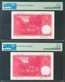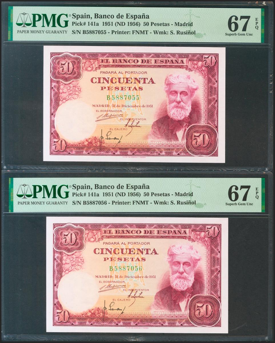 50 Pesetas. 31 de Diciembre de 1951. Pareja correlativa. Serie B. (Edifil 2021: 462a, Pick: 141a). RarÃsima en esta calidad, apresto original. SC. Encapsulado PMG67EPQ, ambos.