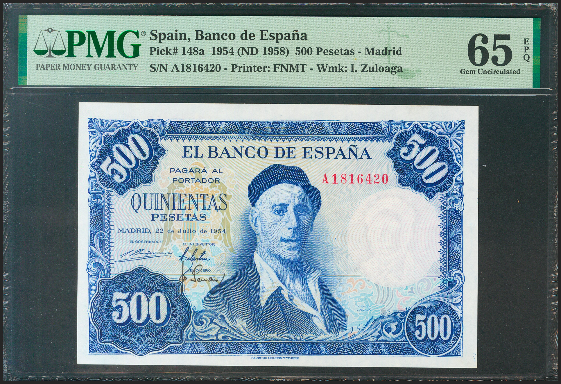 500 Pesetas. 22 de Julio de 1953. Serie A. (Edifil 2021: 468a, Pick: 148a). Inusual en esta calidad, apresto original. SC. Encapsulado PMG65EPQ.