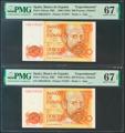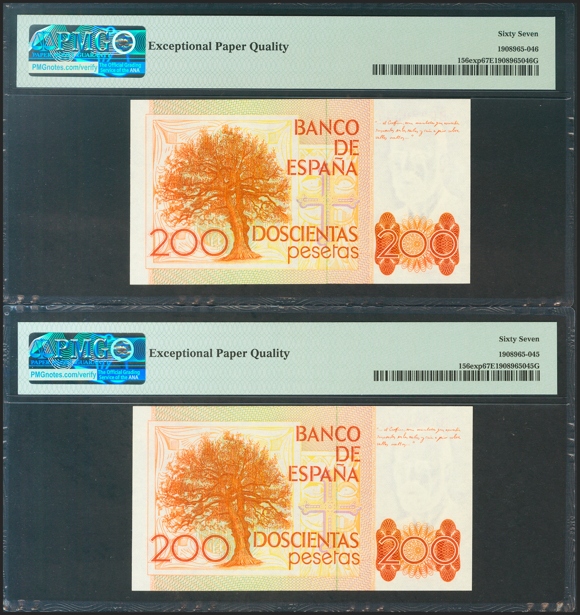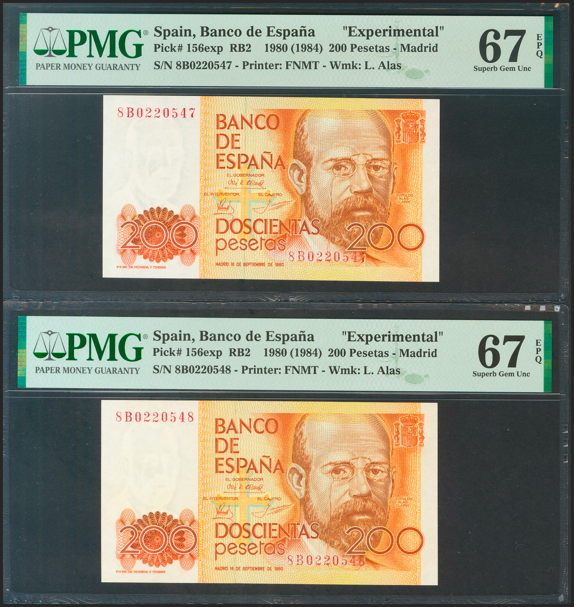 200 Pesetas. 16 de Septiembre de 1980. Pareja correlativa. Serie especial 8B. (Edifil 2021: 480c, Pick: 156exp). RarÃsima en esta excepcional calidad, apresto original. SC. Encapsulado PMG67EPQ, ambos.