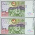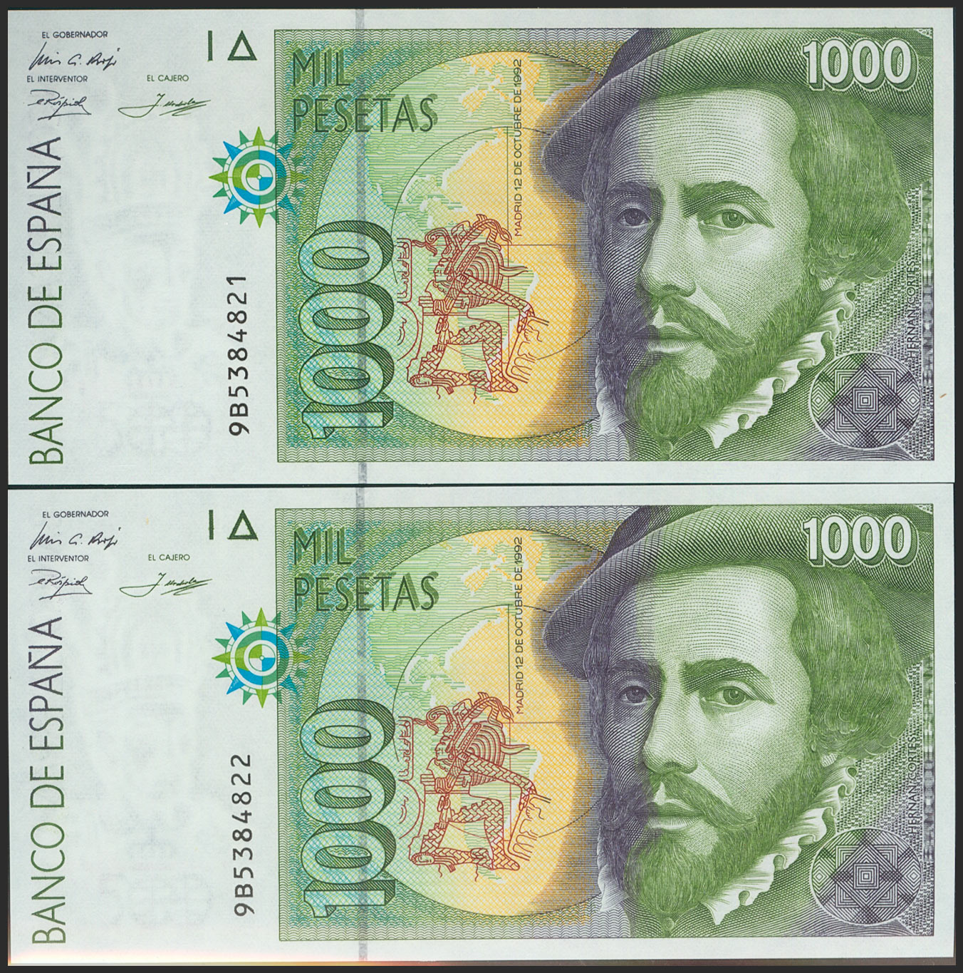 1000 Pesetas. 12 de Octubre de 1992. Pareja correlativa. Serie especial 9B. (Edifil 2021: 483c). SC.