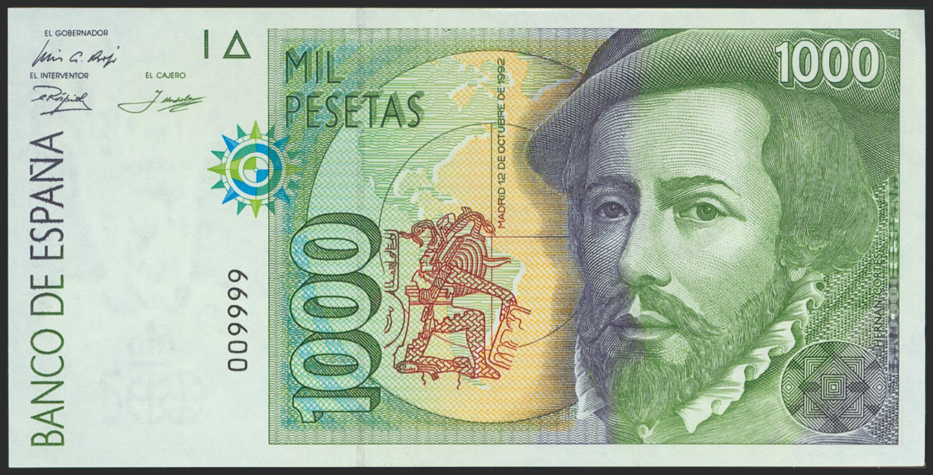 1000 Pesetas. 12 de Octubre de 1992. Sin serie y numeración muy baja y capicúa imperfecto. (Edifil 2021: 483). SC.
