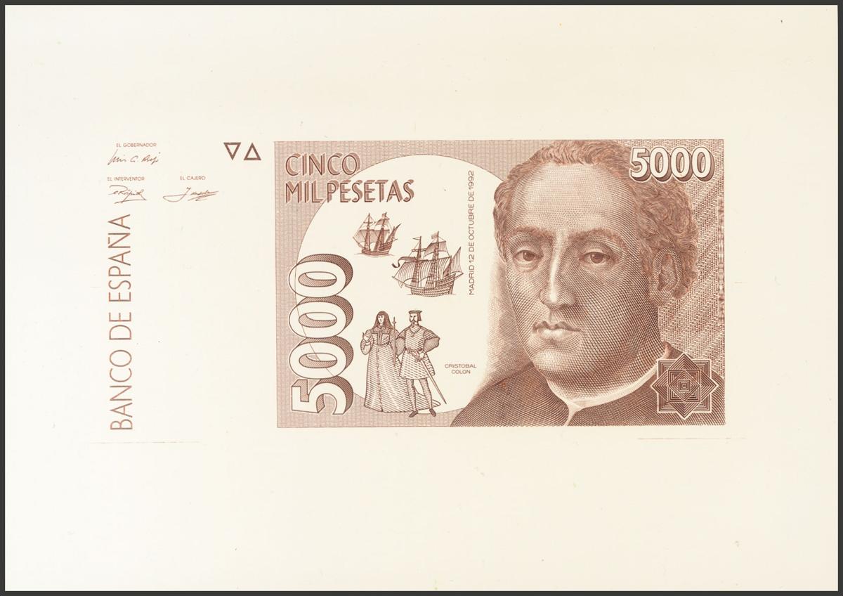 Conjunto de 2 Pruebas definitivas tanto del anverso como el reverso del billete de 5000 Pesetas emitido el 12 de Octubre de 1992. No catalogadas en Edifil. Muy raras y espectaculares.