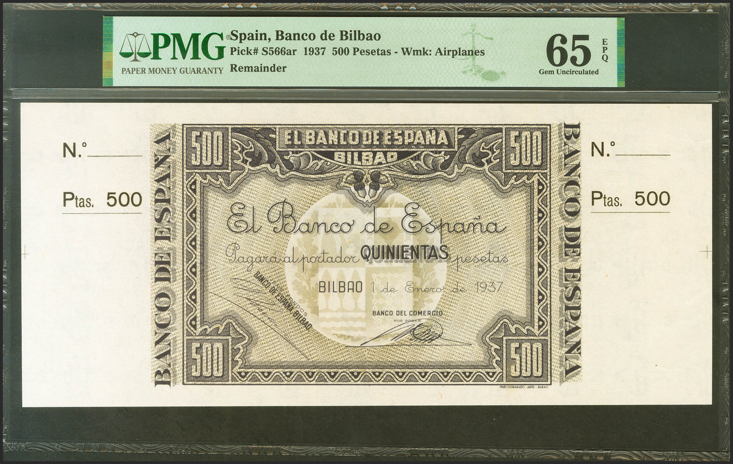 500 Pesetas. 1 de Enero de 1937. Sucursal de Bilbao, antefirma Banco del Comercio. Sin serie y sin numeración, con ambas matrices. (Edifil 2021: NE26c, Pick: S566ar). Muy raro en esta excepcional conservación, apresto original. SC. Encapsulado PMG65EPQ. (para hacerse una idea de la rareza de este billete en esta calidad, PMG otorga a dÃa 1 de Marzo de 2023, la segunda mejor calificación compartiéndola con otros tres billetes).
