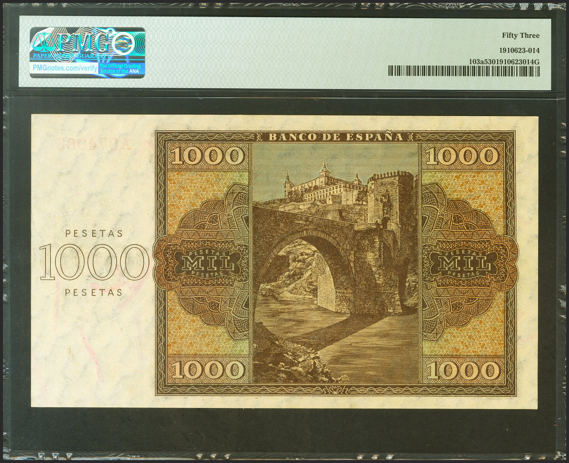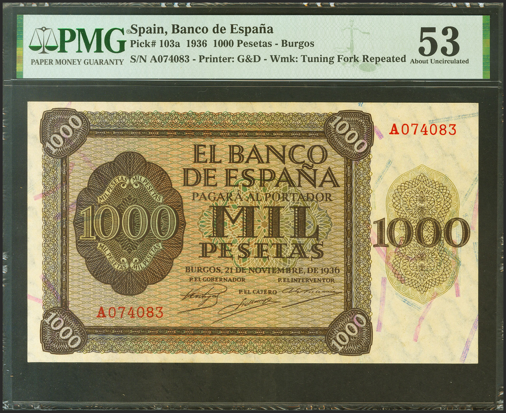 1000 Pesetas. 21 de Noviembre de 1936. Serie A. (Edifil 2021: 423, Pick: 103a). Raro en esta excepcional calidad. EBC+. Encapsulado PMG53.