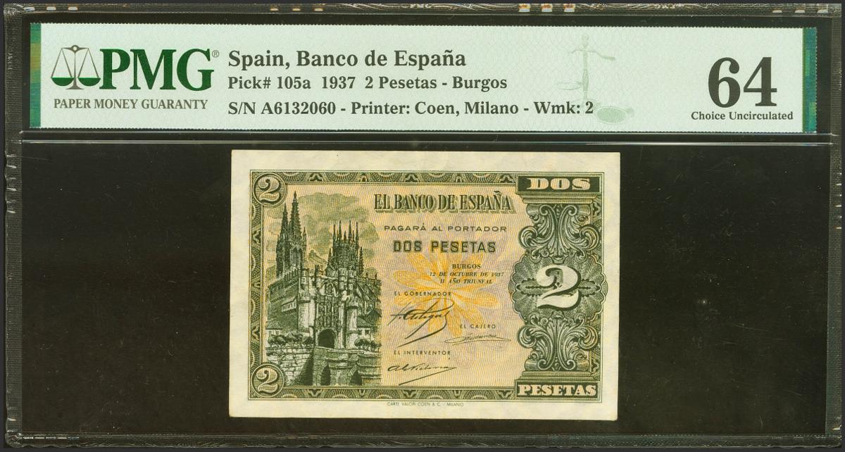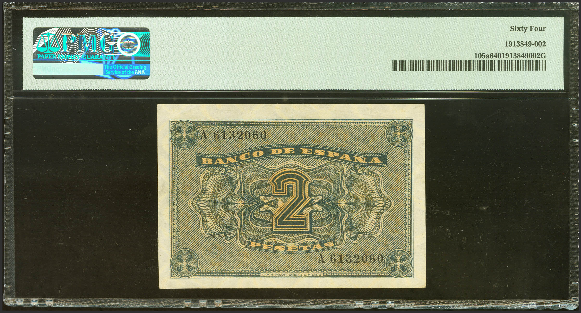 2 Pesetas. 12 de Octubre de 1937. Serie A. (Edifil 2021: 426, Pick: 105a). Inusual en esta calidad. SC. Encapsulado PMG64.