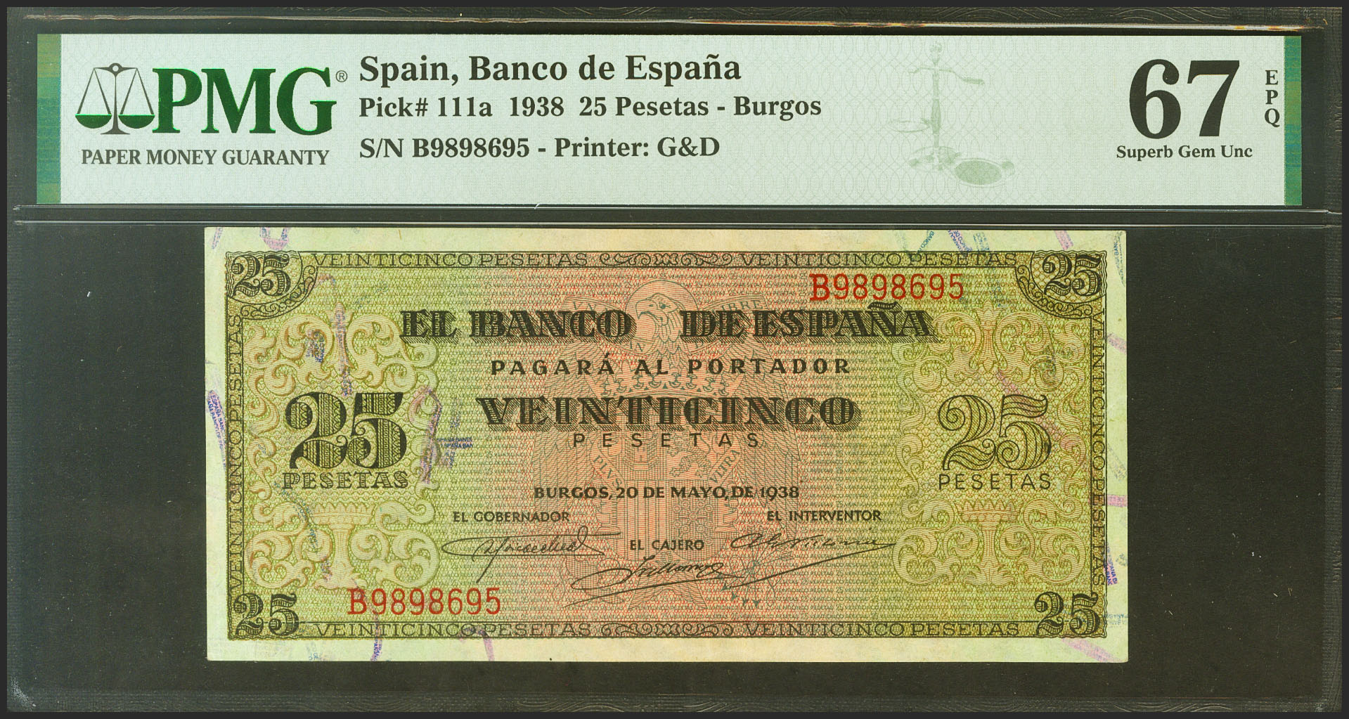 25 Pesetas. 20 de Mayo de 1938. Serie B. (Edifil 2021: 430a, Pick: 111a). RarÃsimo en esta excepcional calidad, apresto original. SC. Encapsulado PMG67EPQ.