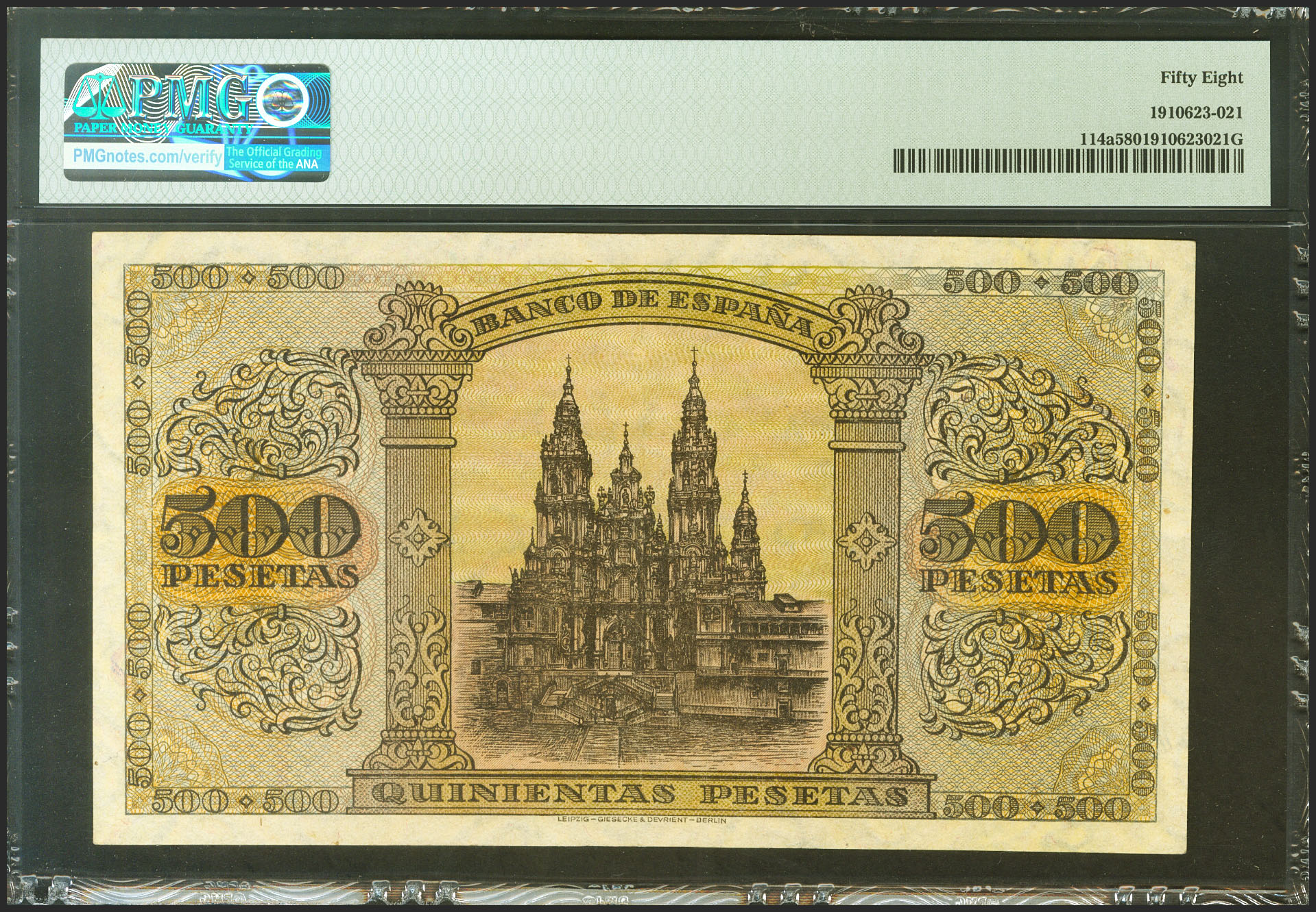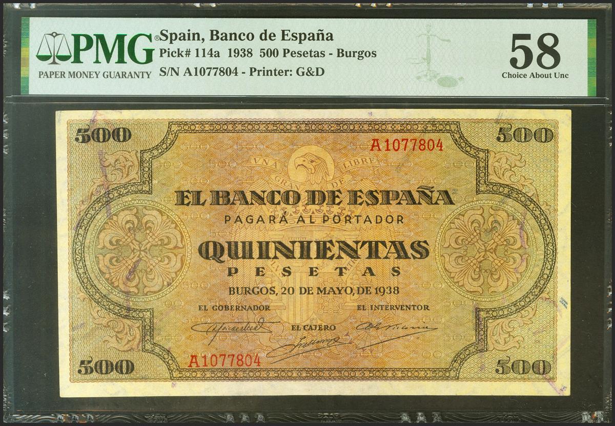 500 Pesetas. 20 de Mayo de 1938. Serie A. (Edifil 2021: 433, Pick: 114a). Inusual en esta calidad, apresto original. EBC+. Encapsulado PMG58.