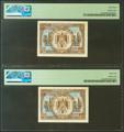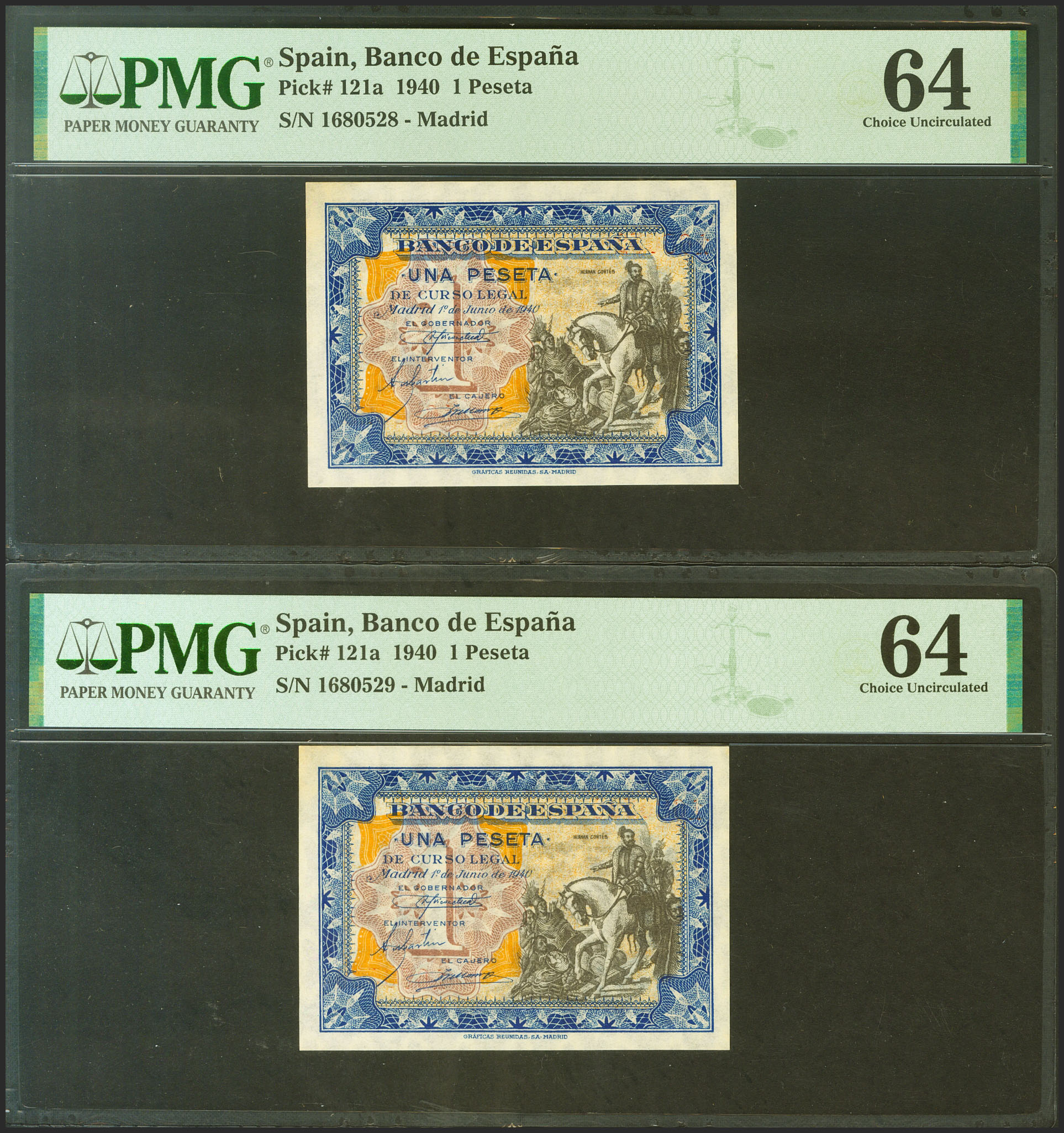 1 Peseta. 1 de Junio de 1940. Pareja correlativa. Sin serie. (Edifil 2021: 441, Pick: 121a). Inusual. SC. Encapsulado PMG64.