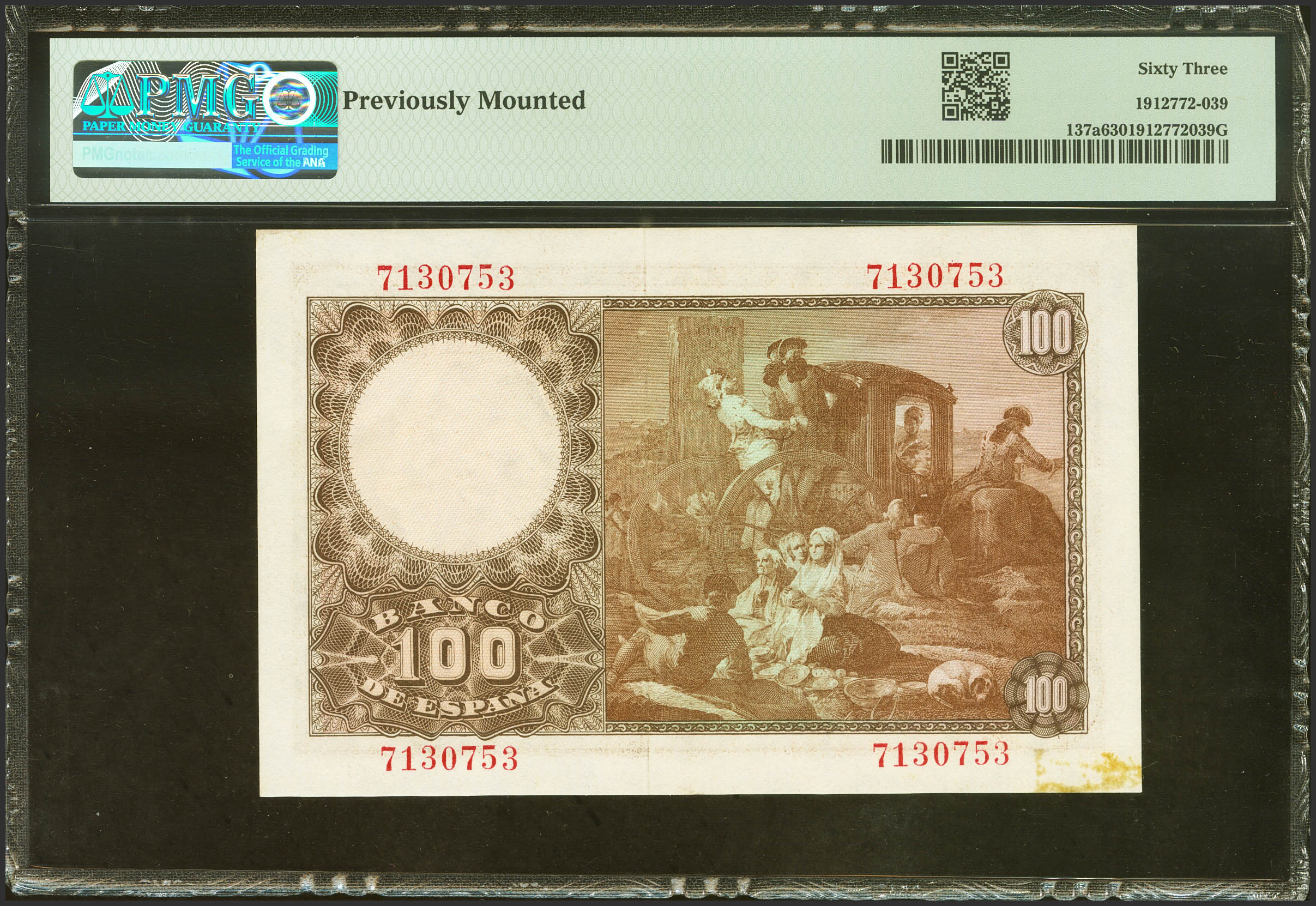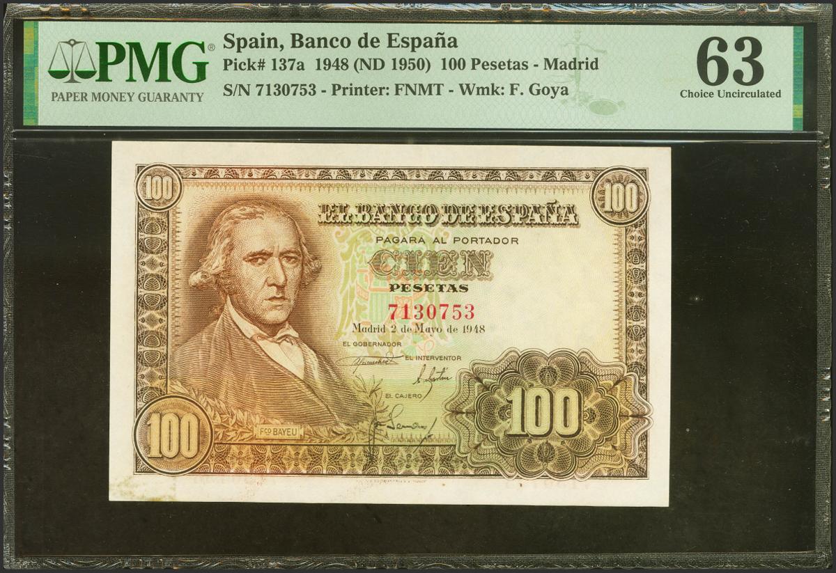 100 Pesetas. 2 de Mayo de 1948. Sin serie. (Edifil 2021: 456, Pick: 137a). SC-. Encapsulado PMG63 (previously mounted).