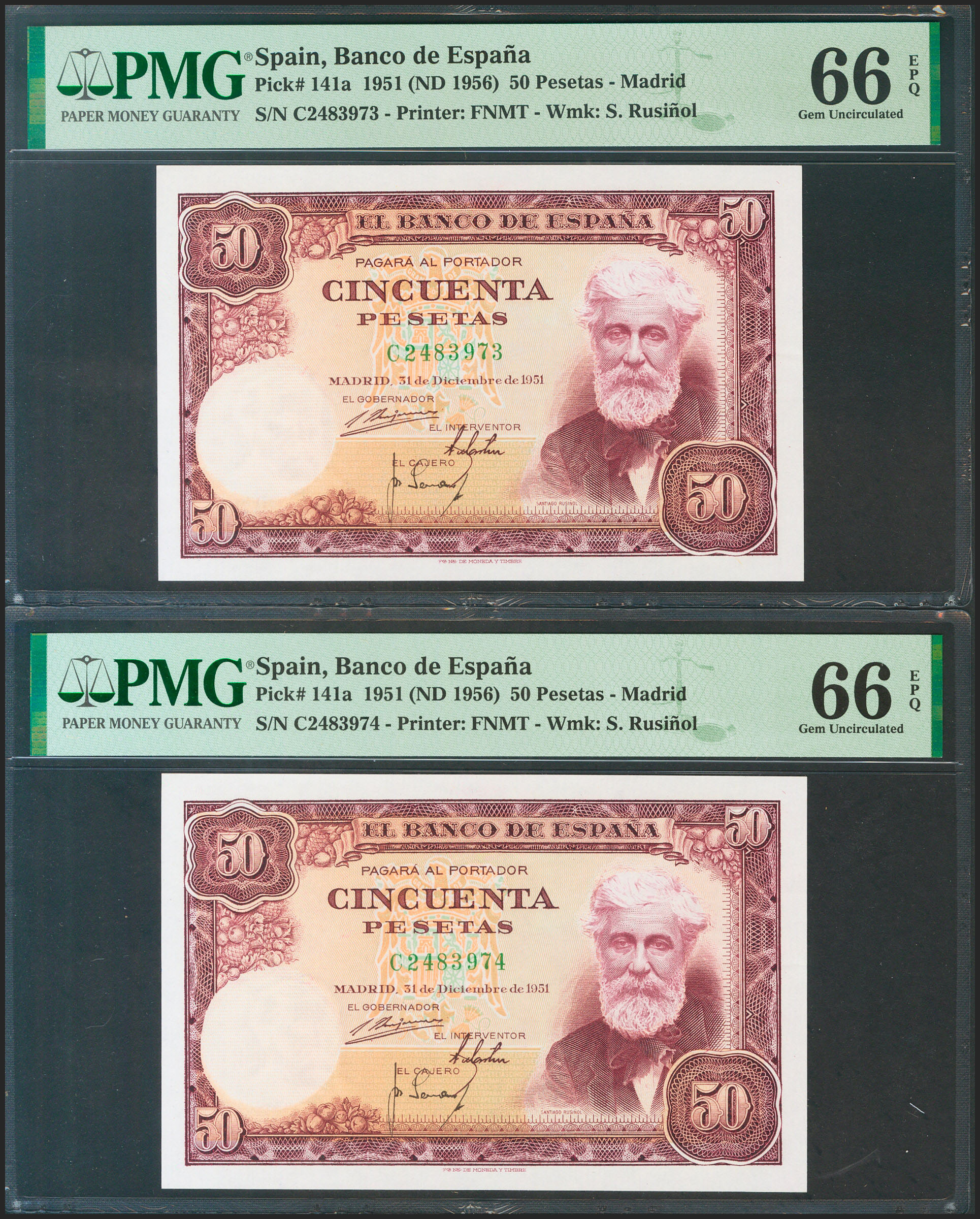 50 Pesetas. 31 de Diciembre de 1951. Pareja correlativa. Serie C. (Edifil 2021: 462a, Pick: 141a). RarÃsima en esta calidad, apresto original. SC. Encapsulado PMG66EPQ, ambos.