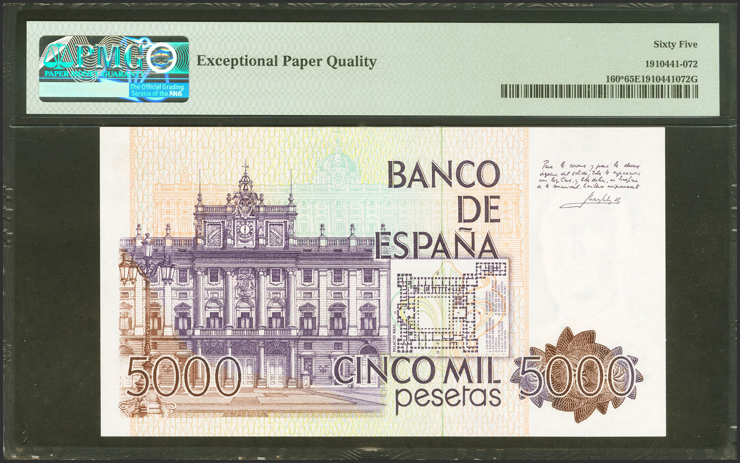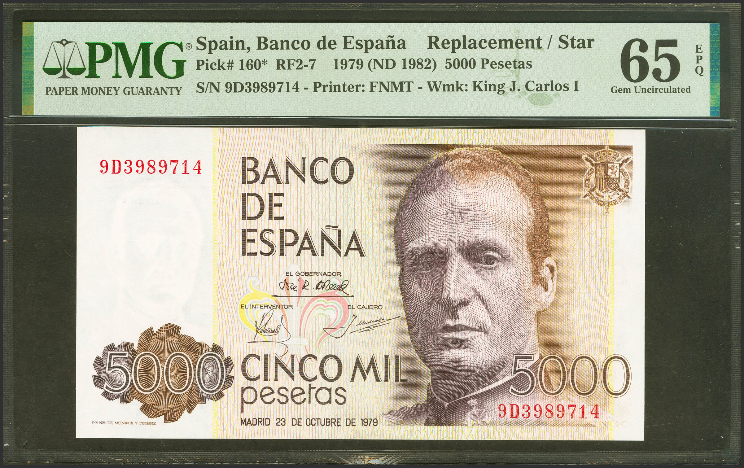 5000 Pesetas. 23 de Octubre de 1979. Serie especial 9D. (Edifil 2021: 478b, Pick: 160*). Apresto original. SC. Encapsulado PMG65EPQ.