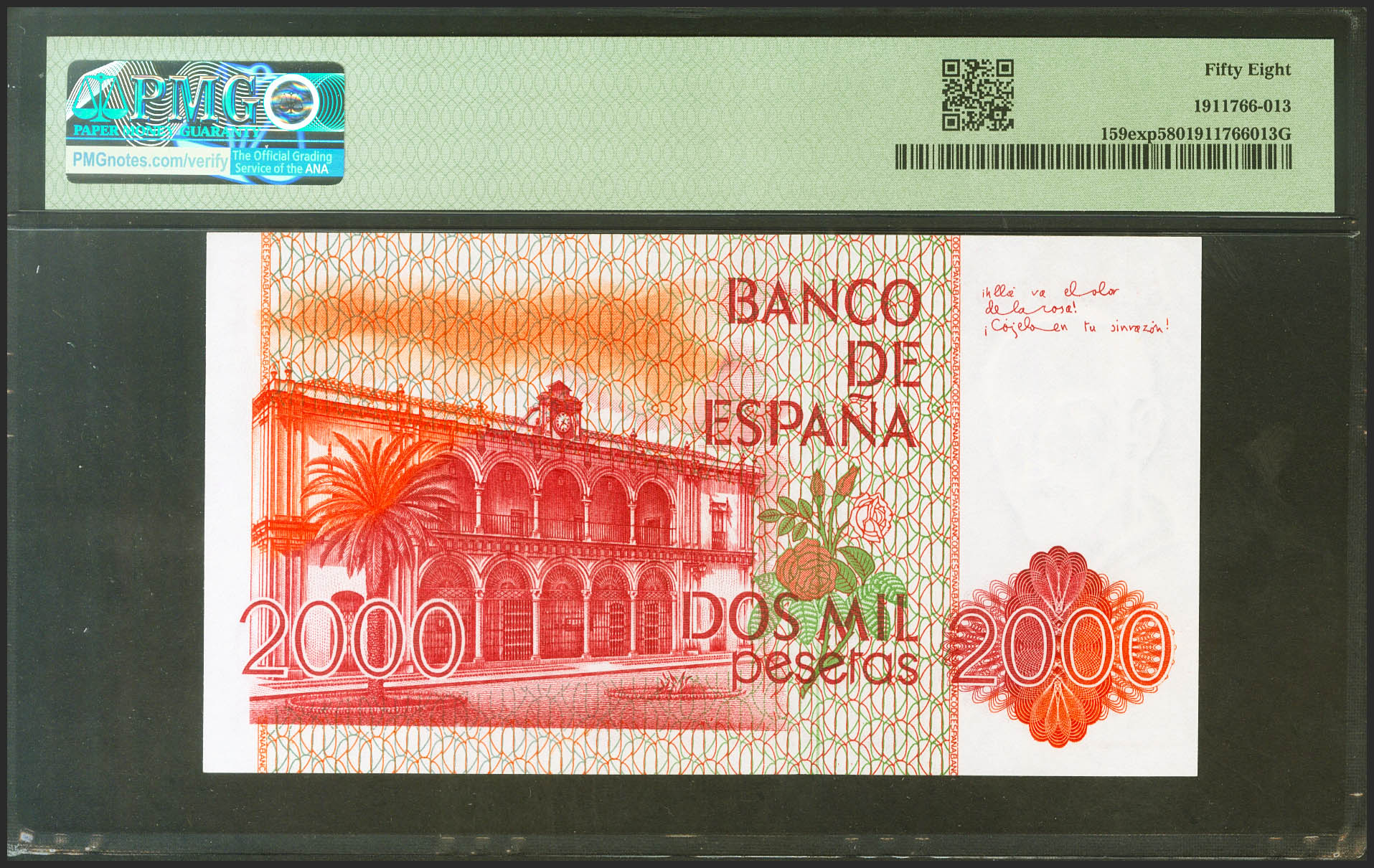 2000 Pesetas. 22 de Julio de 1980. Serie especial 8C. (Edifil 2021: 479c, Pick: 159exp). Extraordinariamente rara serie, para hacernos una idea de su rareza con la información estadÃstica que disponemos nos atrevemos a afirmar que se trata, al menos, de una rareza tan importante como la serie 9B de RosalÃa de Castro. EBC++. Encapsulado PMG58.