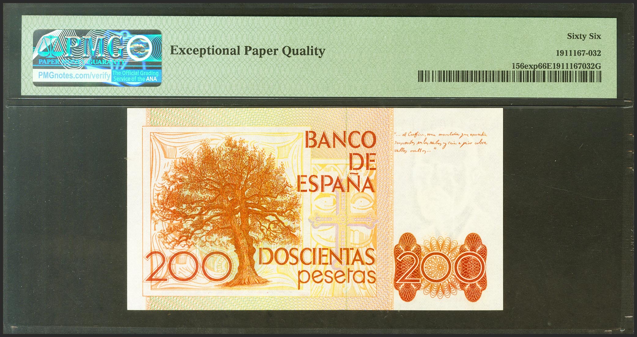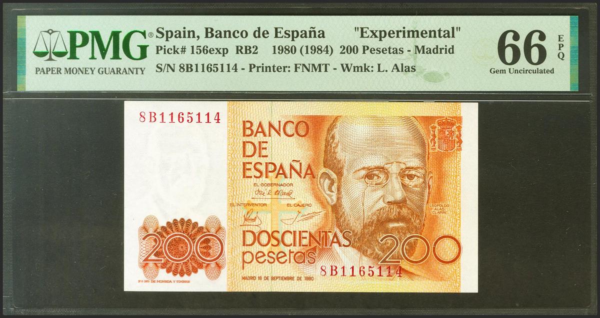 200 Pesetas. 16 de Septiembre de 1980. Serie especial 8B. (Edifil 2021: 480c, Pick: 156exp). Raro en esta excepcional calidad, apresto original. SC. Encapsulado PMG66EPQ.