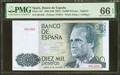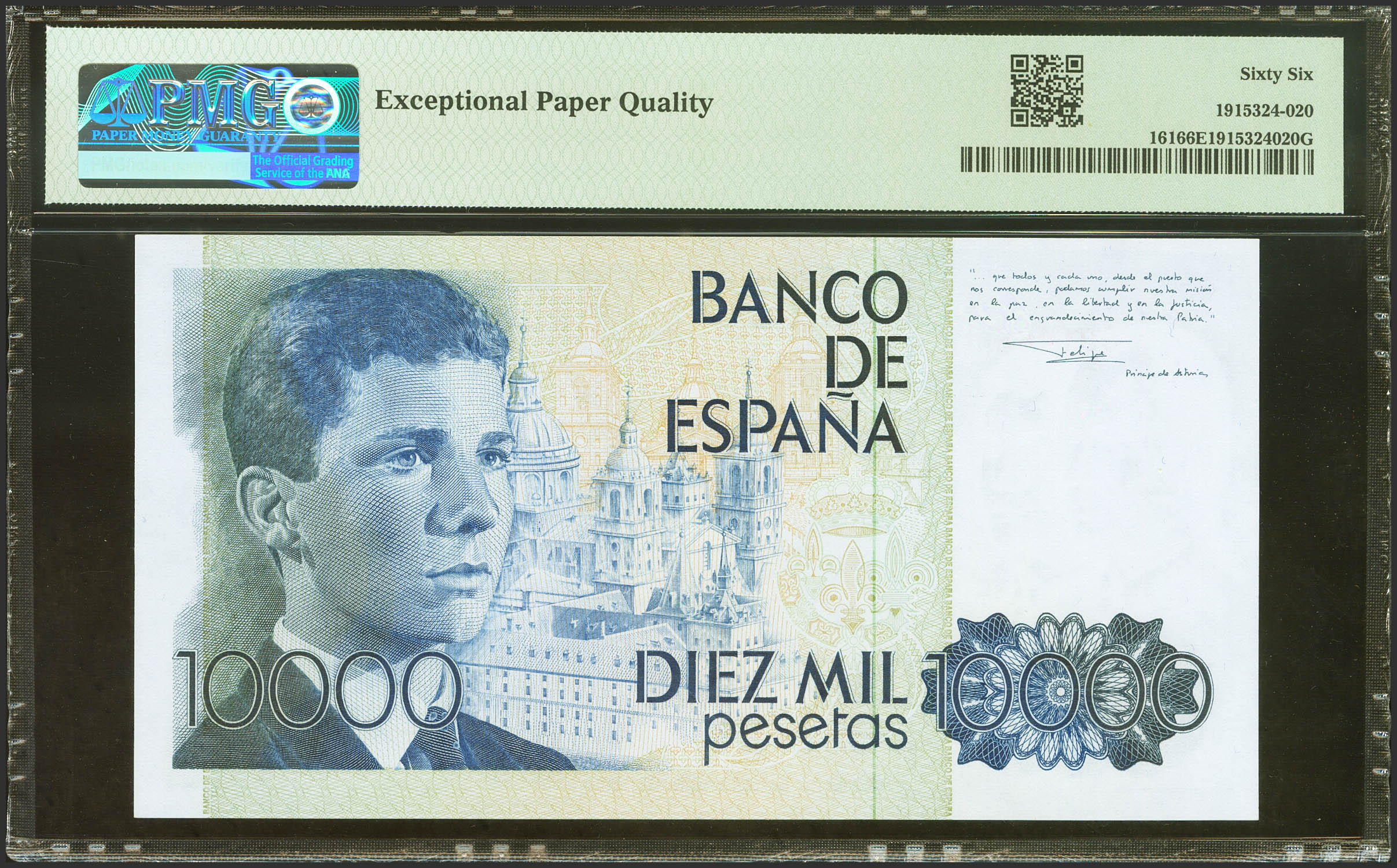 10000 Pesetas. 24 de Septiembre de 1985. Sin serie y bajÃsima numeración. (Edifil 2023: 481, Pick: 161). Raro en esta excepcional calidad. SC. Encapsulado PMG66EPQ.