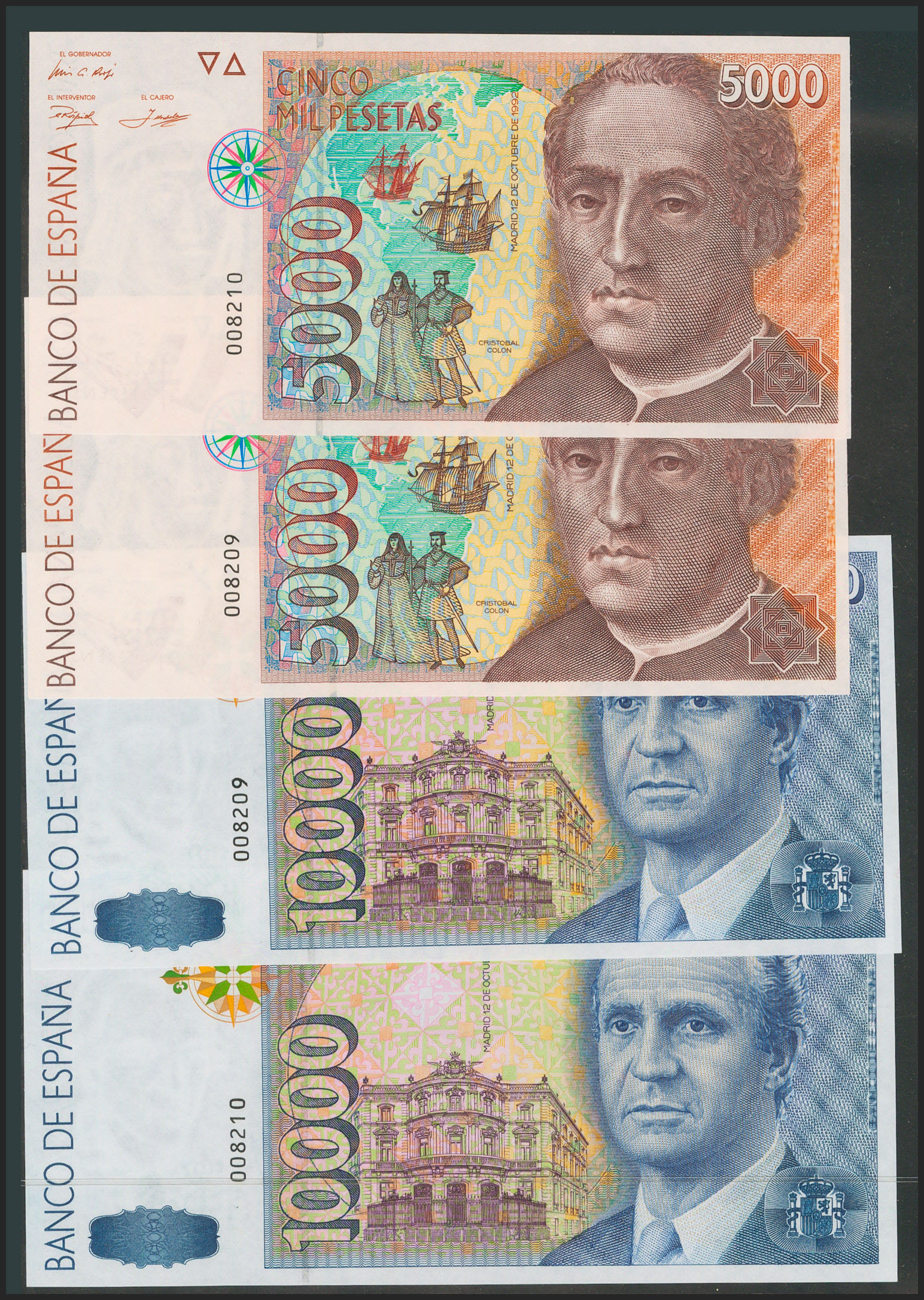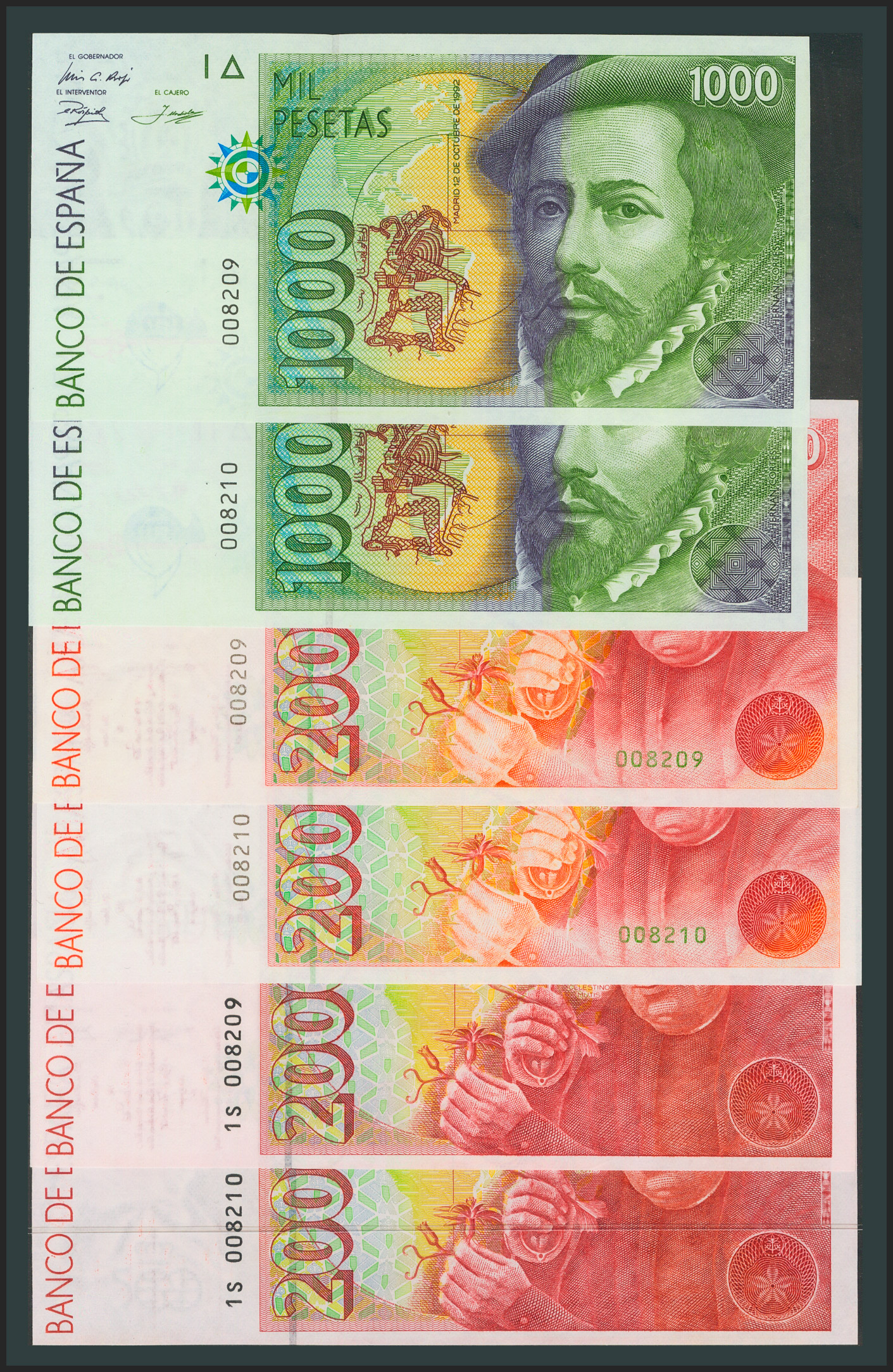 Serie completa de 5 billetes de la emisión de 1992 (incluyendo el de 2000 Pesetas de 1995 con la serie 1S). Pareja correlativa. Sin serie y todos ellos con la misma baja numeración 008209 y 008210. (Edifil 2017: 482/85, 482A). RarÃsimo conjunto. SC.