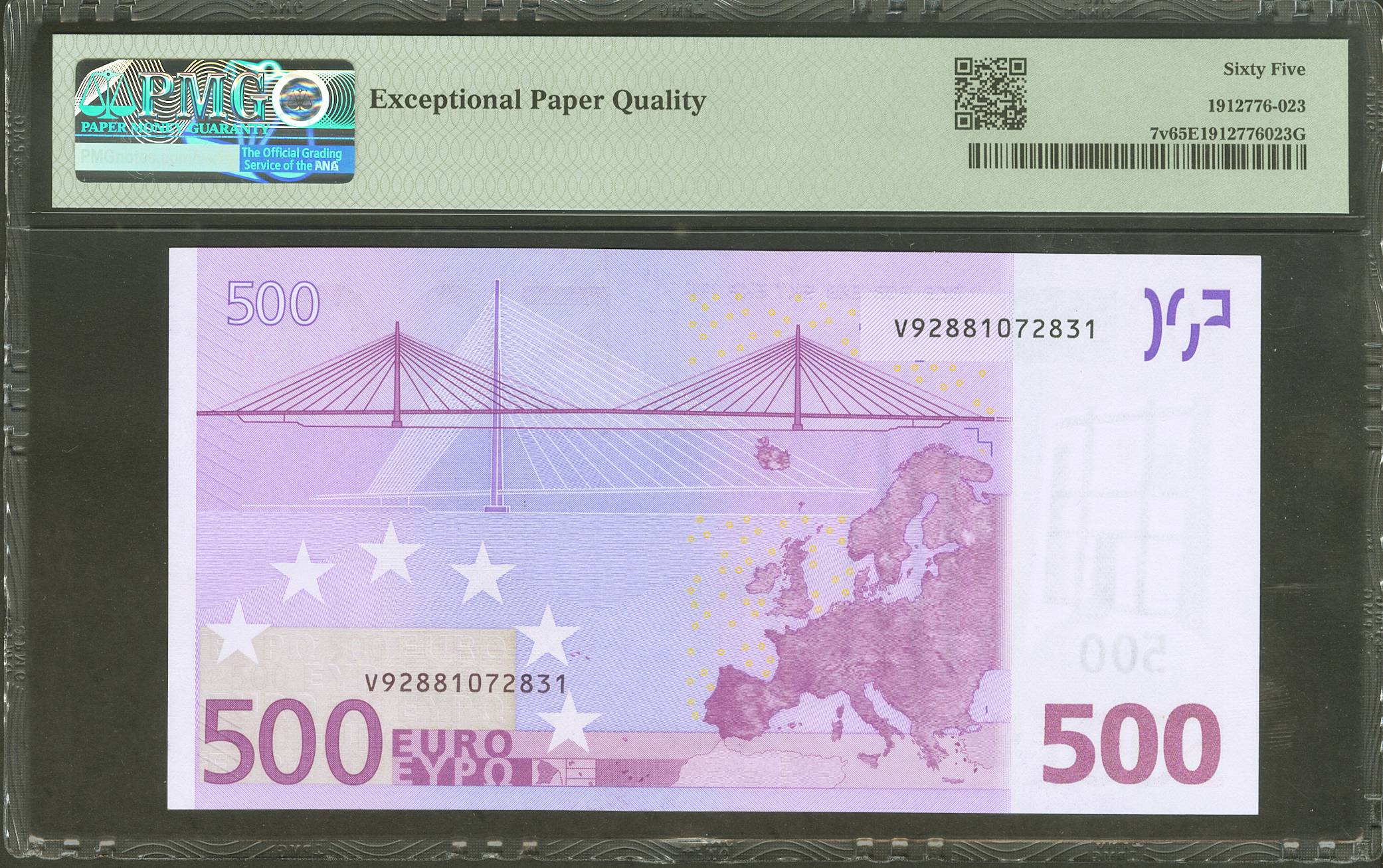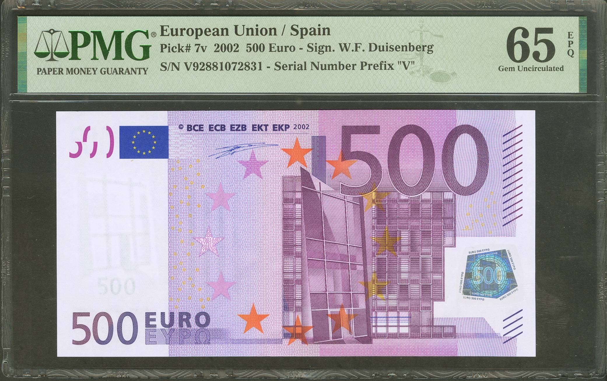 500 Euros. 1 de Enero de 2002. Firma Duisenberg. Serie V (España). (Edifil 2021: 492, Pick: 7v). SC. Encapsulado PMG65EPQ.