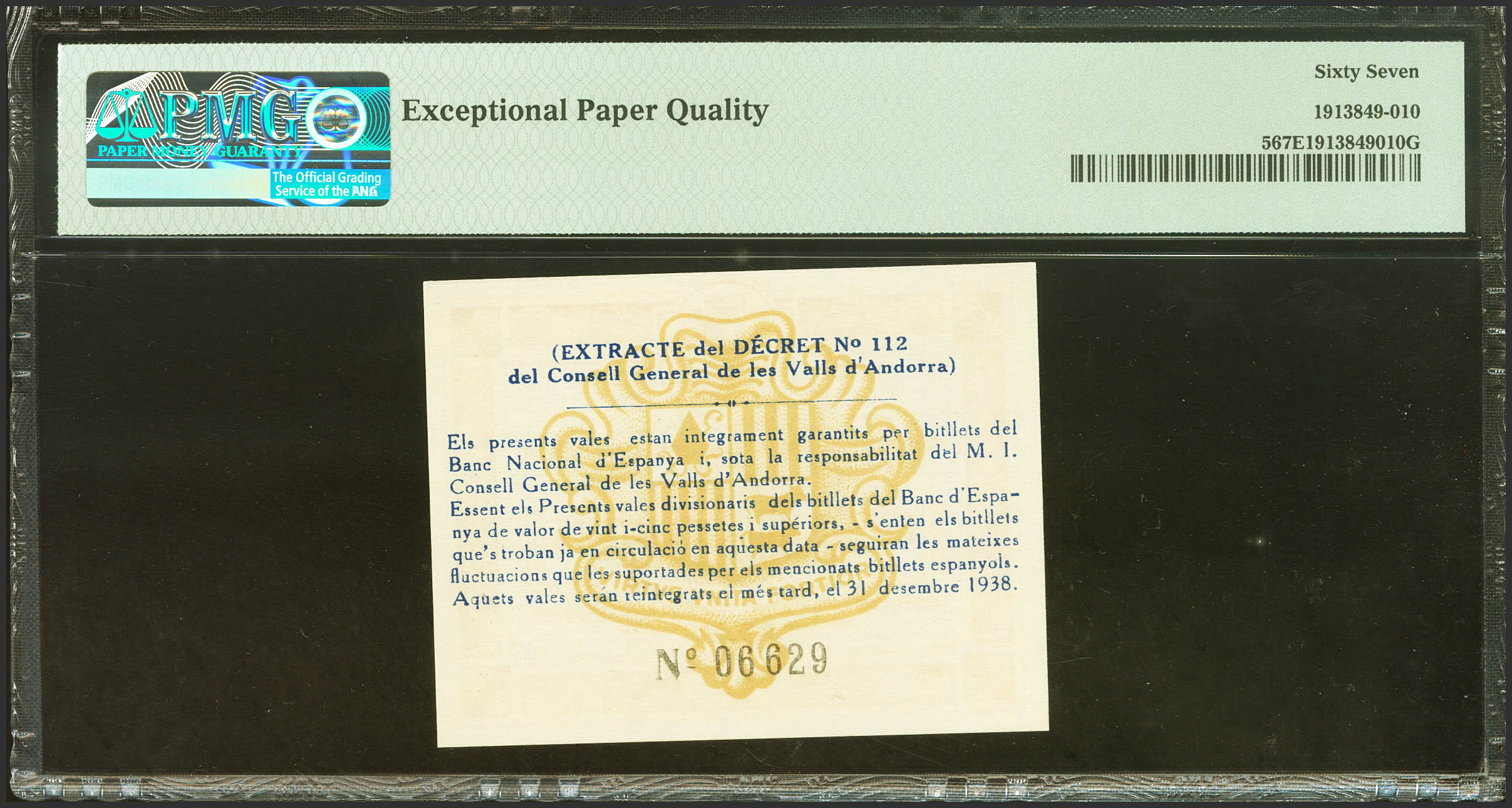 ANDORRA. 50 Centims. 19 de Diciembre de 1936. Sin serie. (Edifil 2021: 1, Pick: 5). Raro en esta excepcional calidad, apresto original. SC. Encapsulado PMG67EPQ.