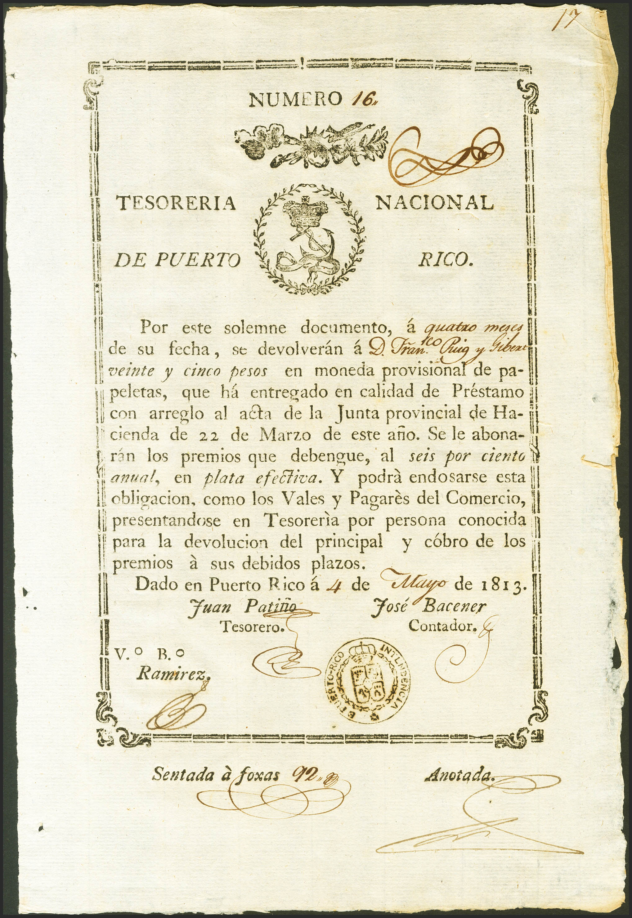 PUERTO RICO. 25 Pesos. 4 de Mayo de 1813. Real TesorerÃa. Sin serie. (Edifil 2021: 4). Muy raro, apresto original. SC-.