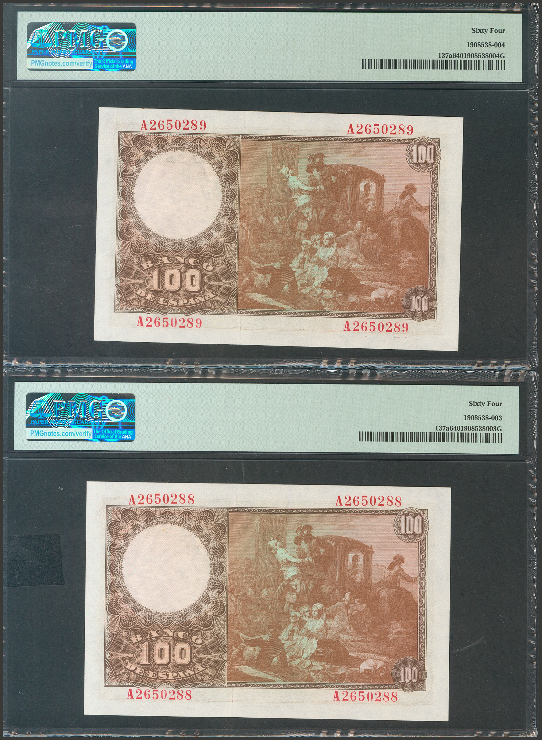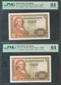 100 Pesetas. 2 de Mayo de 1948. Pareja correlativa. Serie A. (Edifil 2017: 456a). SC. Encapsulados PMG64, ambos.