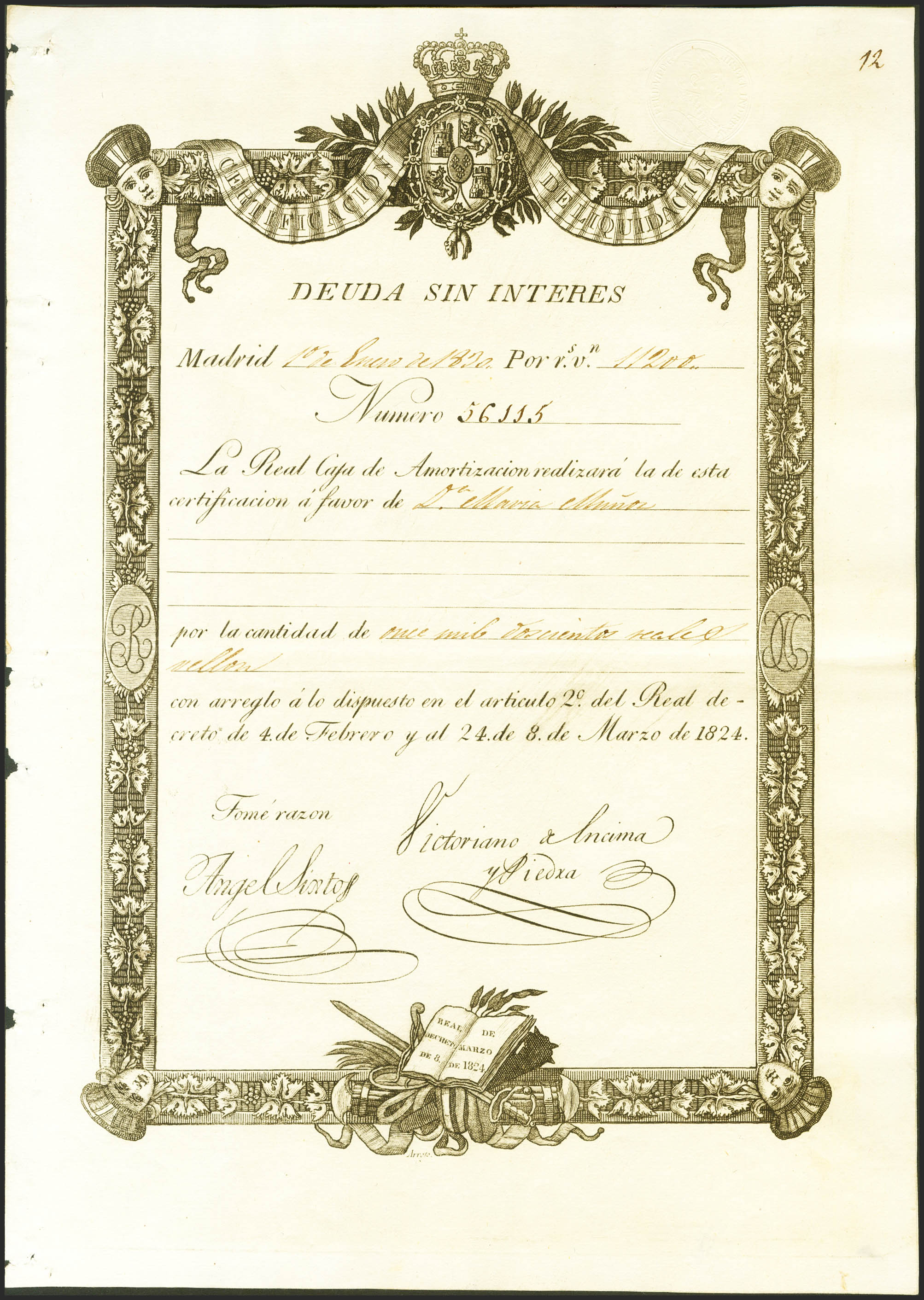 11200 Reales. 1 de Enero de 1830. Sin serie y con numeración. (no catalogado). RarÃsima deuda sin interés. EBC+.