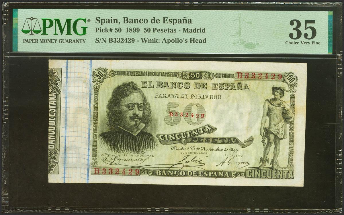 50 Pesetas. 25 de Noviembre de 1899. Serie B. (Edifil 2023: 307a, Pick: 50). Raro en esta conservación, especialmente sin ningún tipo de reparaciones. MBC+. Encapsulado PMG35.
