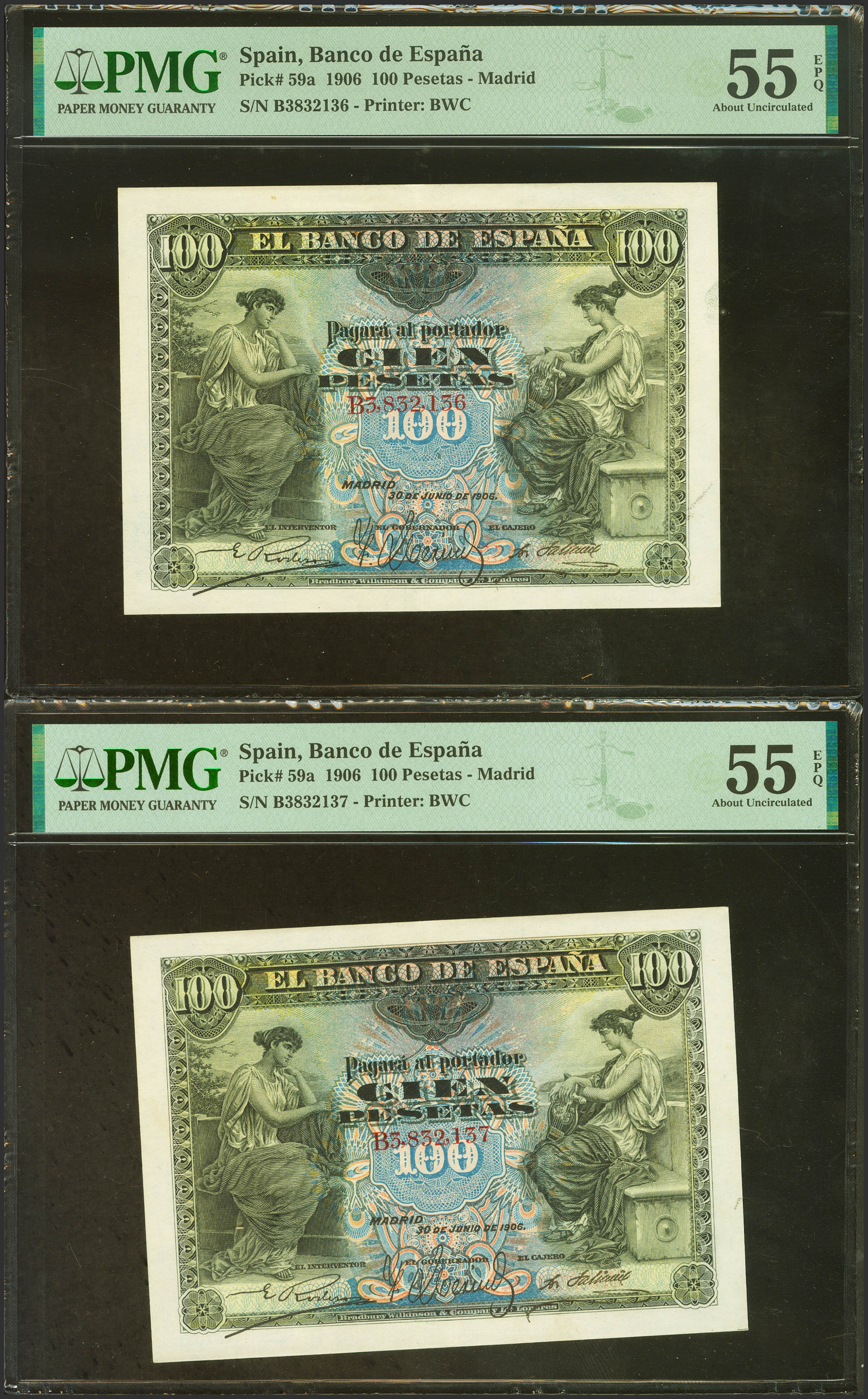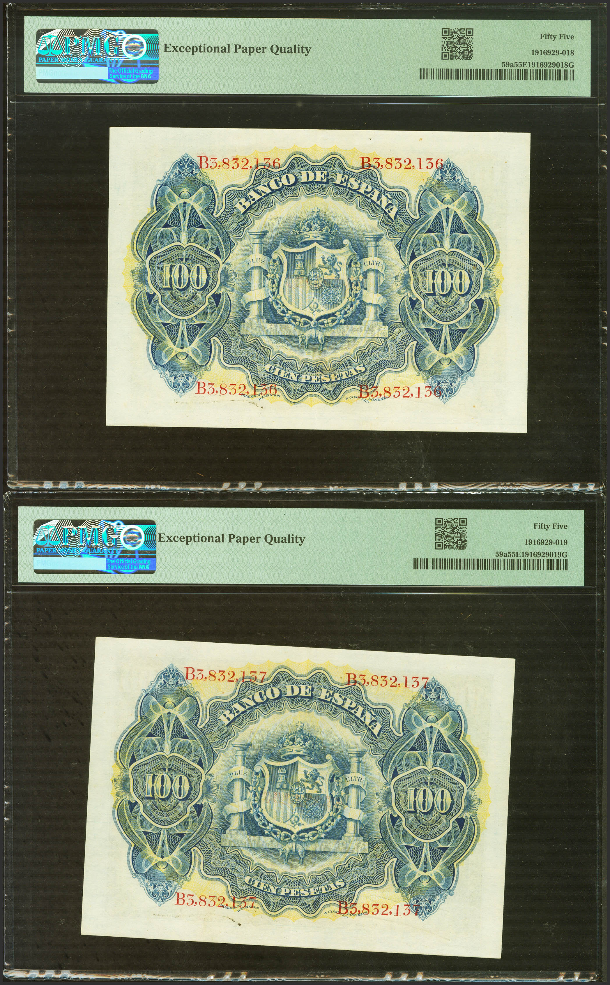 100 Pesetas. 30 de Junio de 1906. Pareja correlativa. Serie B. (Edifil 2023: 313a, Pick: 59a). Apresto original. EBC++. Encapsulados PMG55EPQ, ambos.