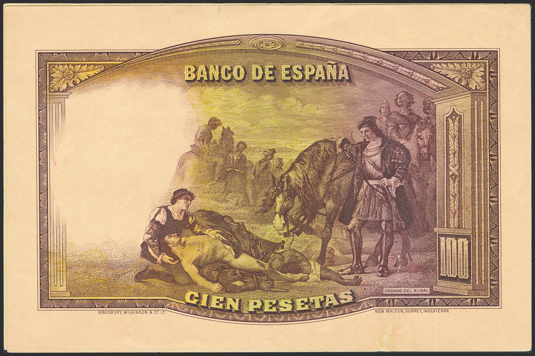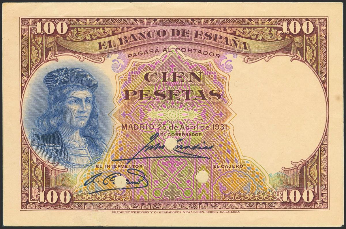 100 Pesetas. 25 de Abril de 1931. Pruebas de color de anverso y reverso, sin serie y taladros en las firmas. (Edifil 2023: 360Pa, 360Pb). RarÃsimo, conserva todo su apresto original. SC-.