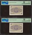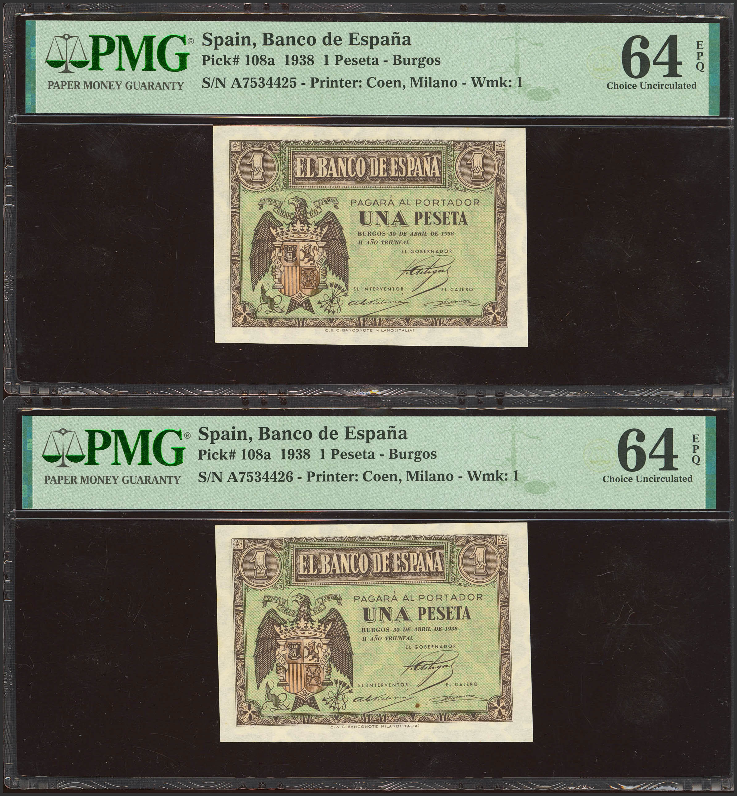 1 Pesetas. 30 de Abril de 1938. Pareja correlativa. Serie A. (Edifil 2023: 428, Pick: 108a). Apresto original. SC. Encapsulado PMG64EPQ, ambos.