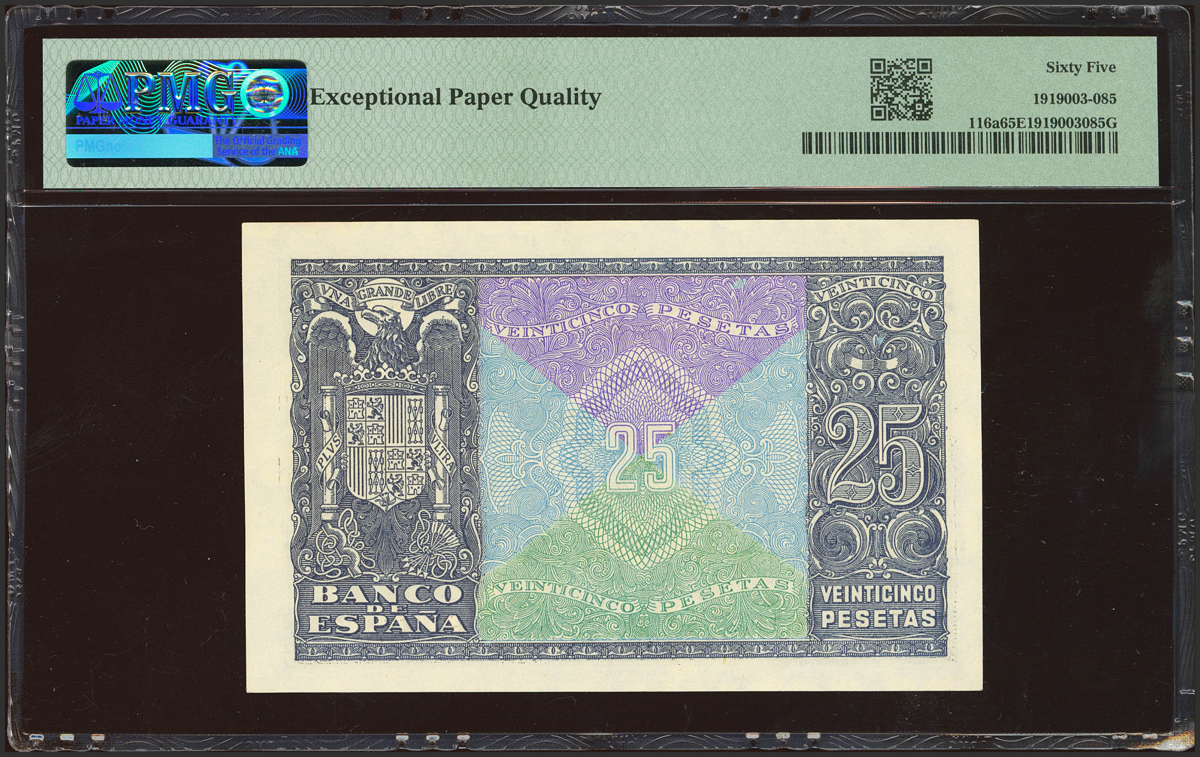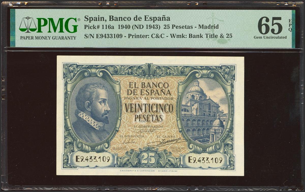 25 Pesetas. 9 de Enero de 1940. Serie E. (Edifil 2023: 436a, Pick: 116a). Raro en esta excepcional calidad, apresto original. SC. Encapsulado PMG65EPQ.