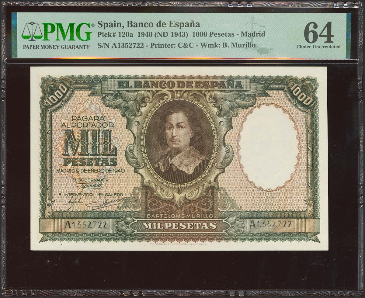 1000 Pesetas. 9 de Enero de 1940. Serie A. (Edifil 2023: 440, Pick: 120a). Extraordinariamente raro, especialmente en esta excepcional calidad. Encapsulado PMG64. (para hacernos idea de la rareza, a fecha 1 de Junio de 2024, el billete se trata del mejor calificado junto a otros dos en PMG, este mismo billete fue subastado el 14 de Diciembre de 2005 en Cayón con el lote Nº1455, fue descrito como el mejor ejemplar conocido, condición que casi 20 años después no ha variado y adjudicado en esa venta por 13.000 euros más la correspondiente comisión, batiendo en su momento un record no superado a dÃa de hoy para un billete tipo del Estado Español)