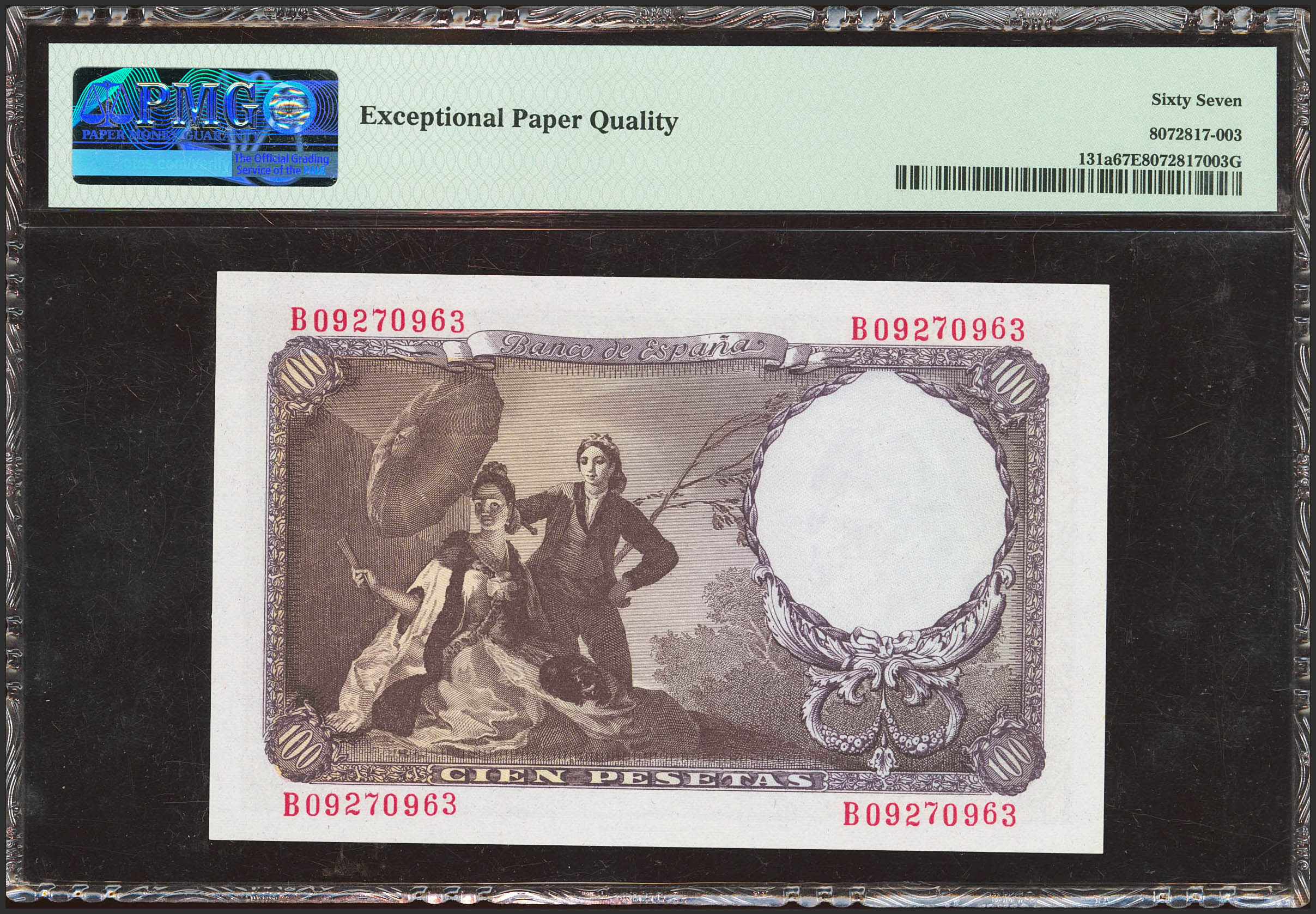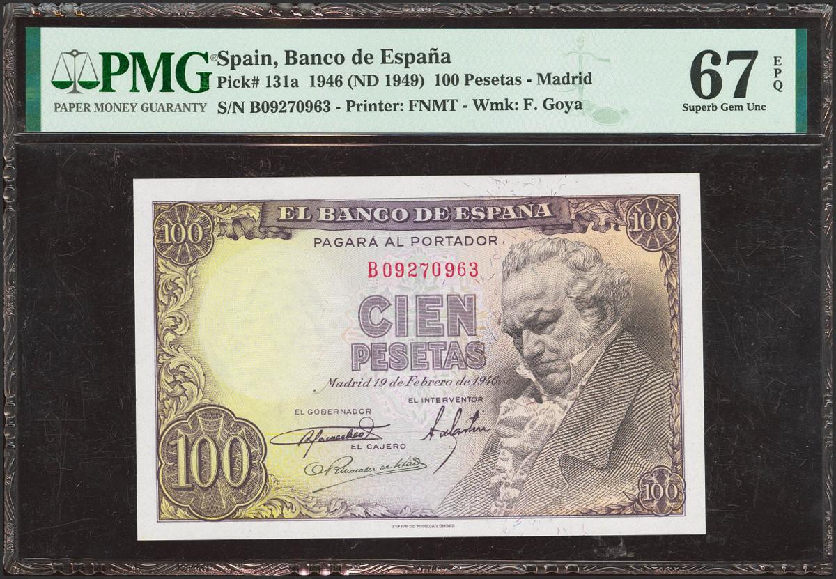 100 Pesetas. 19 de Febrero de 1946. Serie B. (Edifil 2023: 451b, Pick: 131a). Rarísimo en esta excepcional calidad, apresto original. SC. Encapsulado PMG67EPQ.