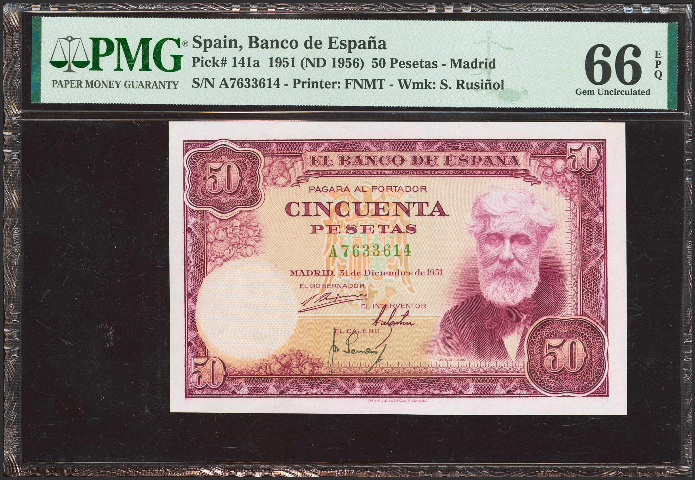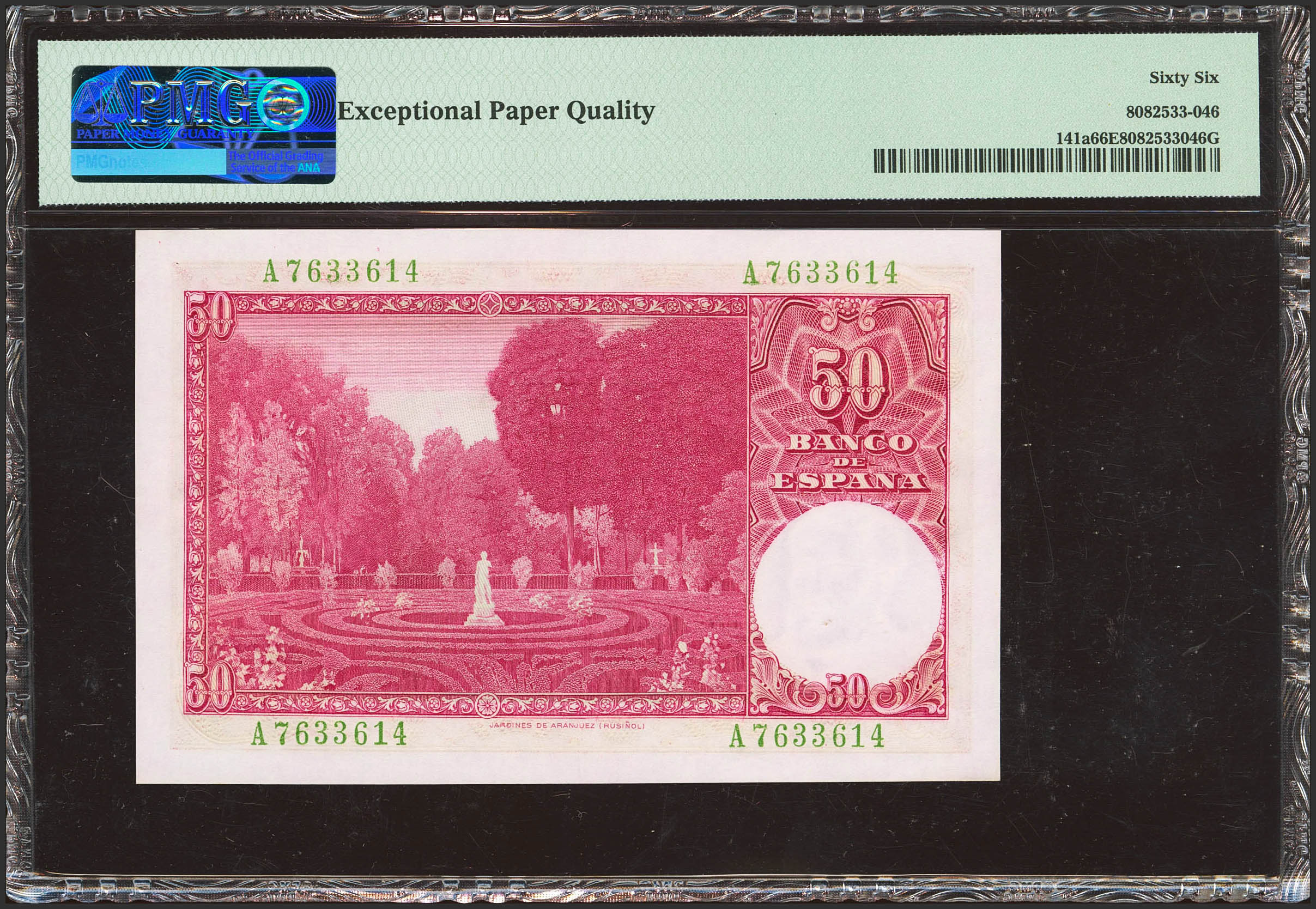 50 Pesetas. 31 de Diciembre de 1951. Serie A. (Edifil 2023: 462a). Inusual conservando todo su apresto original. SC. Encapsulado PMG66EPQ.