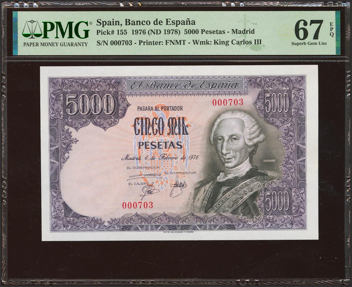 5000 Pesetas. 6 de Febrero de 1976. Sin serie y numeración bajísima (Nº000703). (Edifil 2023: 475, Pick: 155). Raro, especialmente en esta excepcional calidad. SC. Encapsulado PMG67EPQ.