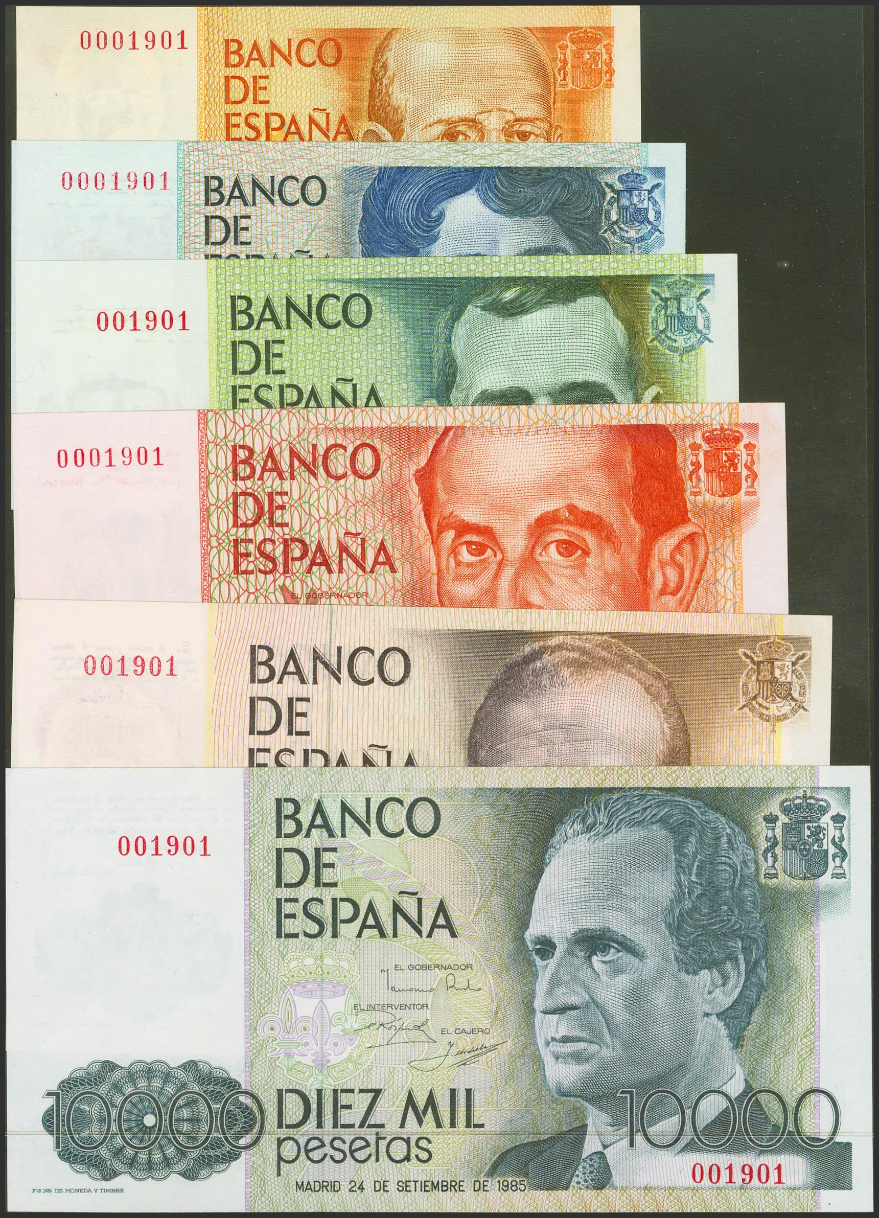 Conjunto de 6 billetes del Banco de España de 200 Pesetas, 500 Pesetas, 1000 Pesetas, 2000 Pesetas, 5000 Pesetas y 10000 Pesetas, todos los billetes emitidos entre 1979 y 1985 (incluyendo el de 5000 Pesetas y 10000 Pesetas, la mayorÃa de juegos se conocen a falta de uno de estos dos billetes), todos sin serie y con la misma baja numeración 0001901. (Edifil 2017: 480, 476, 477, 479, 478, 481). Muy raro conjunto. SC.