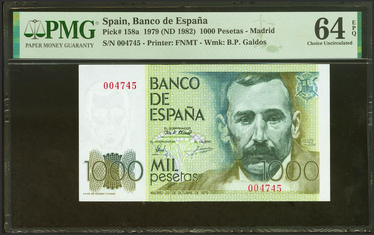 1000 Pesetas. 23 de Octubre de 1979. Sin serie y numeración bajísima. (Edifil 2021: 477, Pick: 158a). SC. Encapsulado PMG64EPQ.