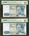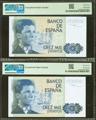 10000 Pesetas. 24 de Septiembre de 1985. Pareja correlativa. Sin serie y bajÃsima numeración. (Edifil 2023: 481, Pick: 161). Muy rara en esta excepcional calidad. SC. Encapsulados PMG67EPQ, ambos.