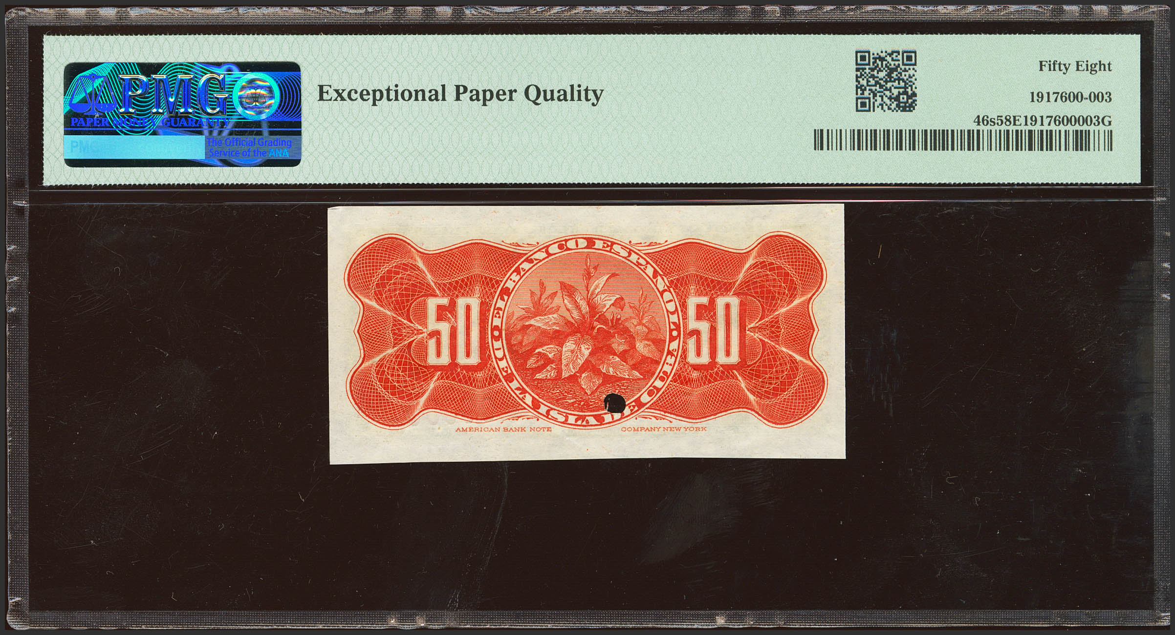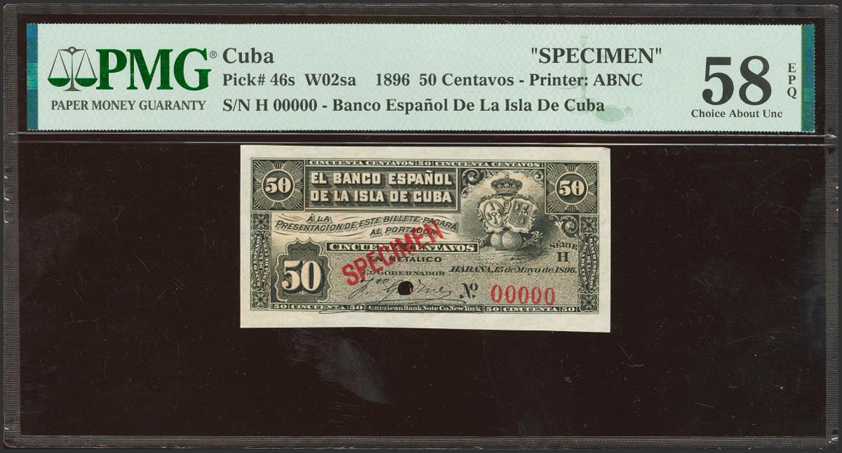 BANCO ESPAÑOL DE LA ISLA DE CUBA. 50 Centavos. 15 de Mayo de 1896. Serie H, Specimen y numeración 00000. (Edifil 2023: 70, Pick: 46s). RarÃsimo. EBC+++. Encapsulado PMG58EPQ.